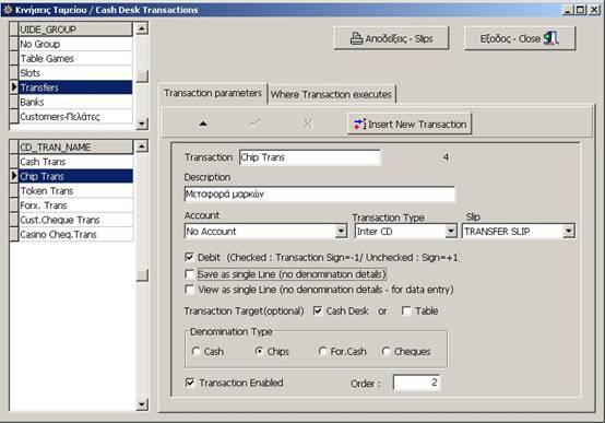 In the second tab of the transaction setup screens, the Administrator or cash Desk manager defines in witch of the CD’s (workstations) this transaction will execute.