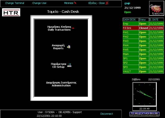The current Gaming Date and the current cash desk status (opened or closed) are displayed on the main screen . “Current cash desk” is the cash desk assigned to the terminal running the software. A list on the right side shows the gaming date and status of the rest of the cash desks. (Green for open, red for closed). The menu’s are in 2 concurrent languages. The system administrator defines the 2 languages of each work station (for example greek-english or spanish-english), the background colors etc. The functionality is grouped as follows: Daily Transactions : The usual transactions processed on this workstation Reports : Management Reports and printouts CD Setup (Parameters) : All the setup functions according to accounts, transactions, etc. This menu is used by cage managers and supervisors Administration : Users rights, and all setup functionality used y the M.I.S. department After login, the menu options are enabled/disabled according to the access level of the user.