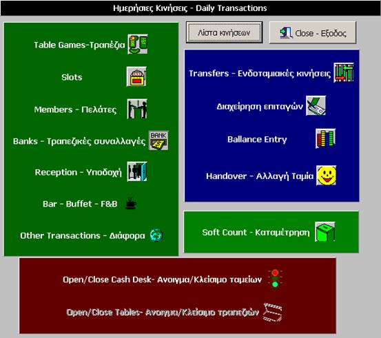 The transactions are grouped to provide a user friendly interface. Some options are hidden if the related transactions are not allowed in the terminal. For example, opening and closing of Table Games are allowed only on some terminals (Fill Bank). The daily transactions include: - Opening – Closing of the cash desk (the CD assigned to this terminal) - Opening – Closing Table Games - Soft Count - Balance Entry and Handover (CD Cashier shift change) - Cheques Management - InterCD Transactions (Transfer Chips / Cash / cheques between CD’s) Standard Transactions for - Table Games (Fills, Credits) - Slots - Customers - Reception - Bar / Restaurant - Other Transactions (TIPS, FOUND MONEY, PROMOTIONS, ERRORS, etc) All transactions are printed in slips,