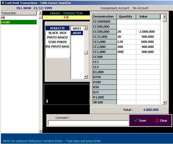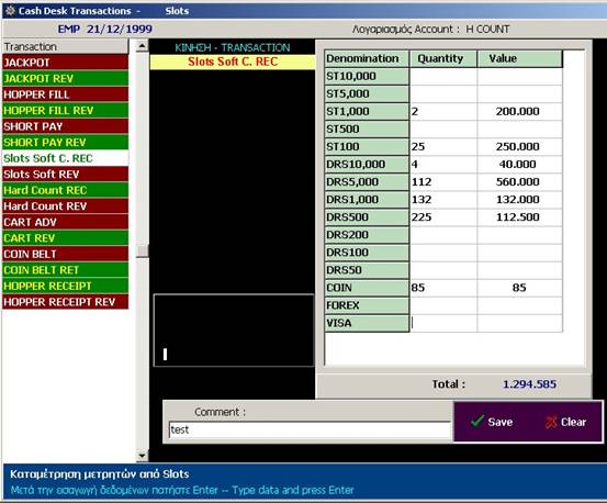 All the installed transaction according to the slot machines are displayed on the left side. The user clicks on the transaction he wishes to enter. Each transaction is displayed in green or red color, that means credit or debit. The selected transaction is highlighted (white with green or red fonts). When the user clicks on a transaction, the full description and a help message is shown in 2 languages at the bottom of the screen. The names of the transactions and the help messages can be defined by the cage manager and can be changed at any time (see “Cash Desk Setup”). If the transaction is defined as “multi line” (f.e. chips), a grid is displayed on the right side. The user enters the quantity of each denomination and the value is calculated by the program, in relation to the denomination value. If the transaction is defined as “single line” (f.e. slots jackpot), only one edit box is displayed to enter the transaction amount. All transactions have an optional comment .