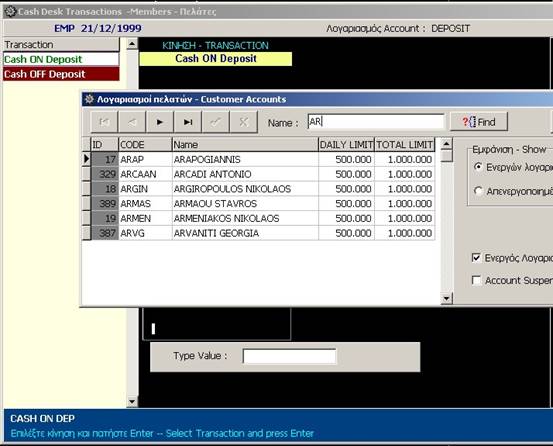 The transaction are stored by customer. Customer accounts are handled as special Secondary Accounts. The user selects the customer in a pop-up form. For each customer, the daily and total limit are displayed. The transaction amount cannot exceed the limit. The only way to make an out of limits transaction is to get authorization from the Casino Manager or the Table Games Manager. The reports for the customer accounts are described in chapter “REPORTS”.