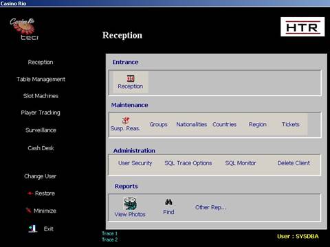 · Registration and member details · Entrance Logging · Online monitoring of the members “in the Casino” · Messages · Suspended / Barred Members notifications · Draw Slip Printouts · Simple search with varius criteria · Membership and attendance statistics (more than 30 reports) · Easy maintenance and Administration · Different user access levels