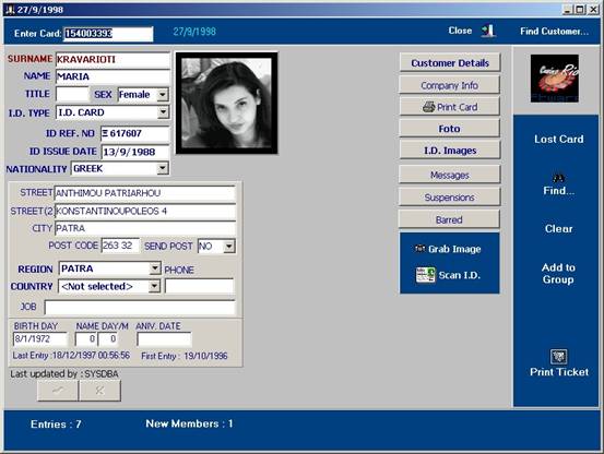 The Reception employee, “swipes” the member’s card from the card reader (f.i. Cherry keyboard). If the customer is a member, entrance is stored to the database, and the member details are shown on reception screen.
