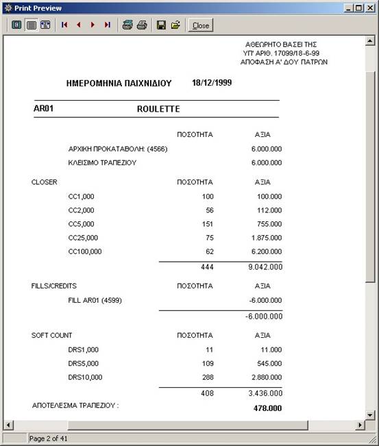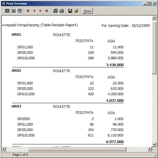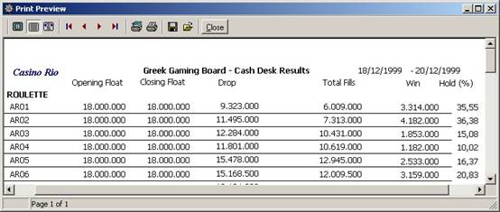 This report displays the opening, Fills , CCF,CCC, closing , soft count and Win amounts for every table game.