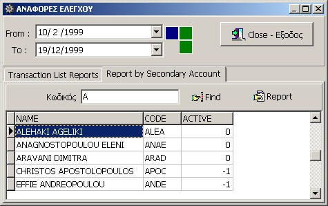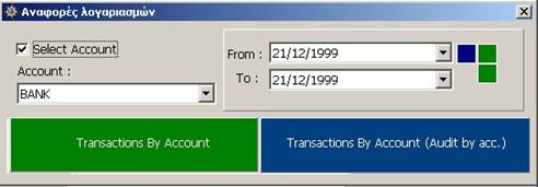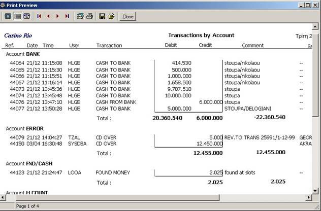 Transactions by account for a selected gaming period. Option to select a specific account or to include all accounts in the report.